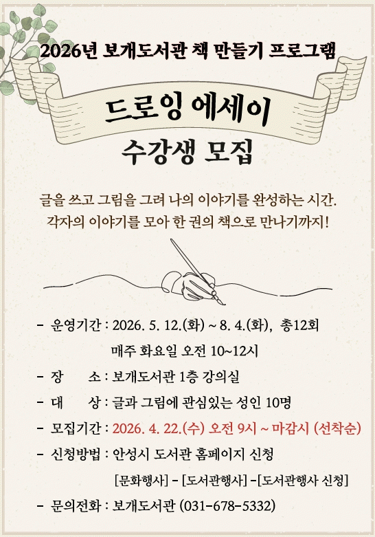 [»çȸ] ¾È¼º½Ã º¸°³µµ¼­°ü, ³ª¸¸ÀÇ Ã¥ ¸¸µé±â ÇÁ·Î±×·¥ 'µå·ÎÀס¤Æ÷Åä ¿¡¼¼ÀÌ' ¿î¿µ |2026. 04.20