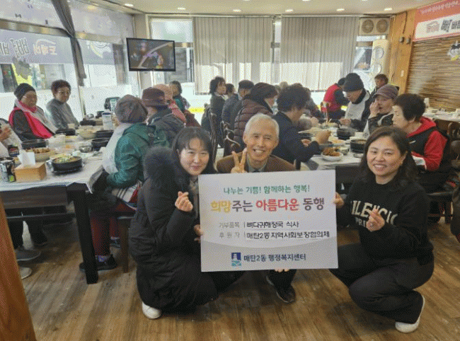 [NWS¹æ¼Û=Çѽ¸ñ ±âÀÚ]Áö³­ 8ÀÏ, ¸Åź2µ¿ Áö¿ª»çȸº¸ÀåÇùÀÇü¿¡¼­ 1:1 °á¿¬À» ¸ÎÀº ¸Åź2µ¿ °æ·Î´ç°ú »ê³²°æ·Î´çÀÇ ¾î¸£½Åµé²² ½Ä»ç ´ëÁ¢À» ÁøÇàÇß´Ù. À̹ø ½Ä»ç ´ëÁ¢Àº °æ·Î´ç ¾î¸£½ÅµéÀÇ °Ç°­ÇÑ °Ç°­³ª±â¸¦ Áö¿øÇϰí, Áö¿ª»çȸÀÇ µû¶æ¡¦