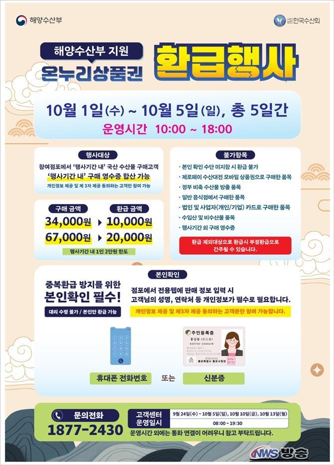 À̹ø ȯ±ÞÇà»ç´Â 10¿ù 1ÀÏ(¼ö)ºÎÅÍ 10¿ù 5ÀÏ(ÀÏ)±îÁö 5Àϰ£ ÁøÇàµÇ¸ç, ¸ÅÀÏ ¿ÀÀü 10½ÃºÎÅÍ ¿ÀÈÄ 6½Ã±îÁö µµ¸Å½ÃÀå ³» ȯ±ÞºÎ½º¿¡¼ ¿î¿µµÈ´Ù. Çà»ç ±â°£ µ¿¾È ±¹³»»ê ¼ö»ê¹° ¹× Á£°¥·ù µî ±¸¸Å °í°´Àº ±¸¸Å±Ý¾×ÀÇ ÃÖ´ë 30%, 1Àδç ÃÖ´ë 2¸¸ ¿ø±îÁö ¿Â´©¸®»óǰ±ÇÀ¸·Î ȯ±Þ¹ÞÀ» ¼ö ÀÖ´Ù.