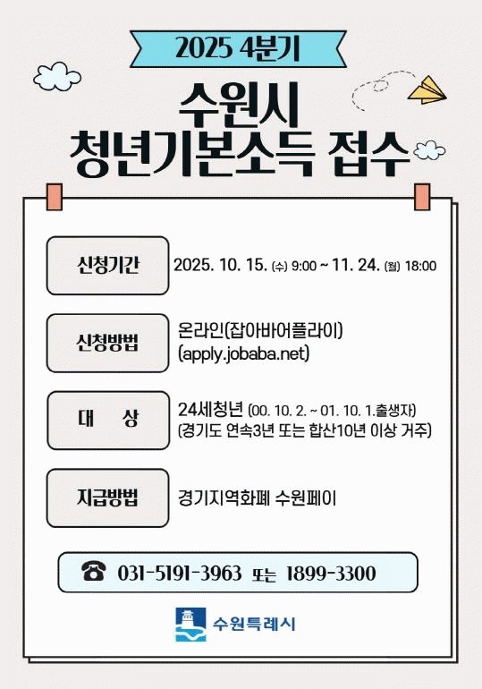 ¼ö¿øÆ¯·Ê½Ã, '2025³â 4ºÐ±â û³â±âº»¼Òµæ' 15ÀϺÎÅÍ Á¢¼ö 10¿ù 15ÀϺÎÅÍ 11¿ù 24ÀϱîÁö Àâ¾Æ¹Ù¿¡¼ ¿Â¶óÀÎÀ¸·Î ½ÅÃ»ÇØ¾ß¡¦ 12¿ù 20ÀÏ Áö±Þ =Çѽ¸ñ ±âÀÚ |