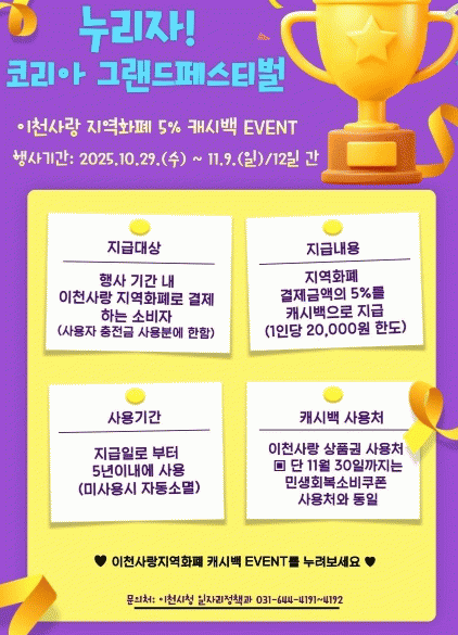 À̹ø Çà»ç´Â 10¿ù 29ÀϺÎÅÍ 11¿ù 9ÀϱîÁö 12Àϰ£ Àü±¹¿¡¼ µ¿½Ã¿¡ °³ÃֵǴ ÄÚ¸®¾Æ±×·£µåÆä½ºÆ¼¹ú ¼ÒºñÃËÁø Ä·ÆäÀÎÀÇ Çϳª·Î, ÀÌõ½Ã´Â ±¹ºñ 1¾ï 5õ¸¸ ¿øÀ» È®º¸ÇØ »ç¿ëÀÚ ÃæÀü±ÝÀ¸·Î °áÁ¦ÇÑ ±Ý¾×¿¡ ÇÑÁ¤ÇØ °áÁ¦±Ý¾×ÀÇ 5%¸¦ Àû¸³±Ý(Àμ¾Æ¼ºê, Á¤Ã¥¼ö´ç µîÀ¸·Î ÃæÀüµÈ ±Ý¾× »ç¿ëºÐÀº Áö±Þ ´ë»ó¿¡¼ Á¦¿Ü)À¸·Î Áö±ÞÇÑ´Ù.