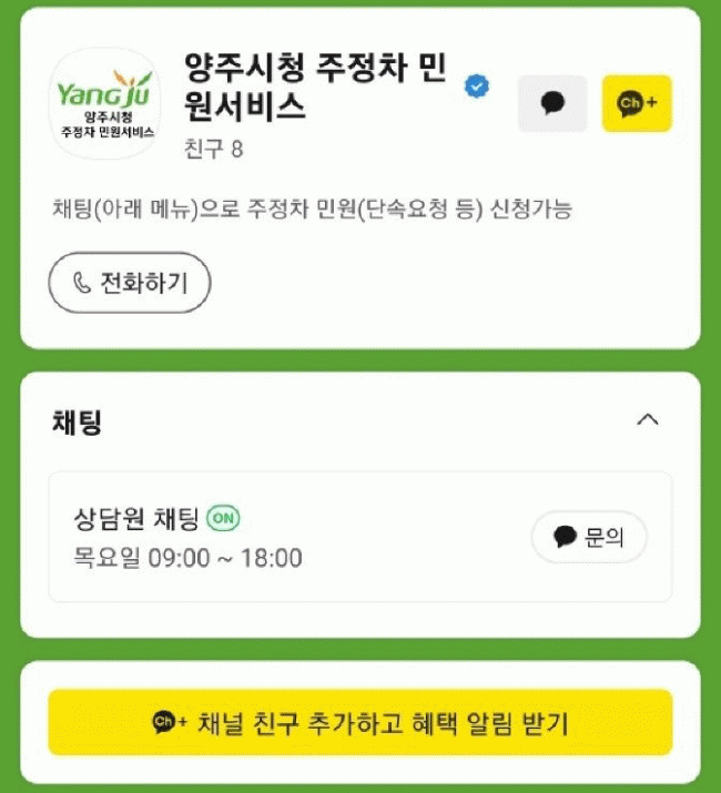 ÀÌ¿ë ¹æ¹ýÀº īī¿ÀÅå »ó´Ü °Ë»öâ¿¡ ¡°¾çÁÖ½Ãû ÁÖÁ¤Â÷ ¹Î¿ø¼ºñ½º¡±¸¦ °Ë»öÇÏ¿© ÇØ´ç À̸§ÀÇ Ã¤³ÎÀ» Ãß°¡ÇÏ°í °øÁö ¹× ¼Ò½Ä È®ÀÎ ¹× ½Ç½Ã°£ äÆÃÀ» ÀÌ¿ëÇÏ¸é µÈ´Ù.