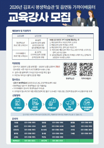 | ±èÆ÷½Ã Æò»ýÇнÀ°ü ¹× À¾¸éµ¿ °¡±îÀ̹è¿òÅÍ 2026³â Æò»ýÇнÀ °»ç °ø°³ ¸ðÁý =Çѽ¸ñ ±âÀÚ |