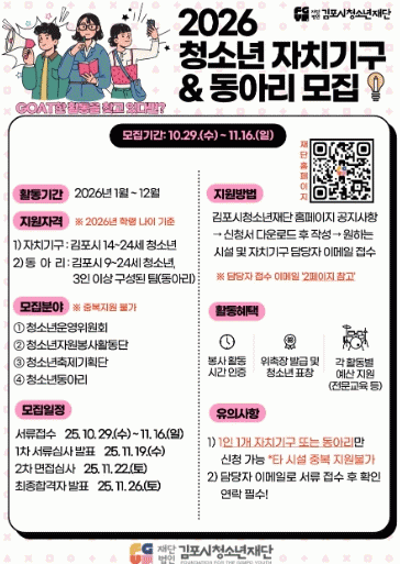 [NWS¹æ¼Û=Çѽ¸ñ ±âÀÚ](Àç)±èÆ÷½Ãû¼Ò³âÀç´Ü¿¡¼ 2026³â ÇÑ ÇØ µ¿¾È ±èÆ÷½Ã û¼Ò³â ¼ö·Ã½Ã¼³À» ÇÔ²² À̲ø¾î°¥ û¼Ò³â ÀÚÄ¡±â±¸ ¹× µ¿¾Æ¸® Âü¿© û¼Ò³âÀ» ¿À´Â 10¿ù 29ÀϺÎÅÍ 11¿ù 16ÀϱîÁö ¸ðÁýÇÑ´Ù.