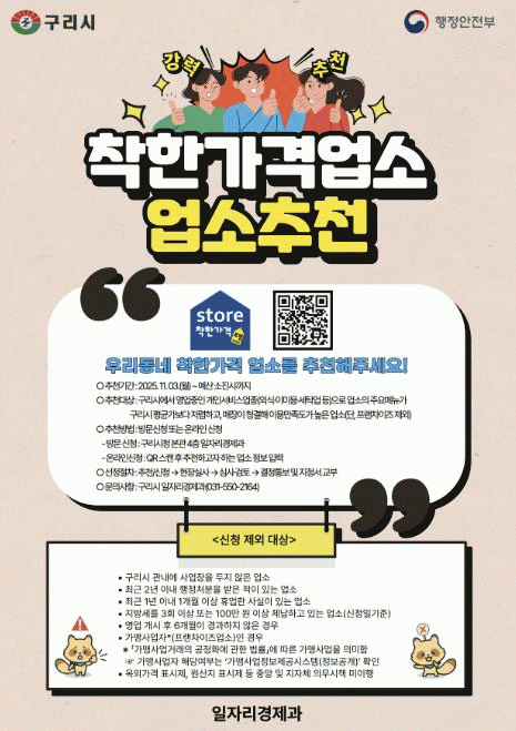 ¡®ÂøÇѰ¡°Ý¾÷¼Ò¡¯´Â ÇàÁ¤¾ÈÀüºÎ¿Í Áö¹æÀÚÄ¡´Üü°¡ °øµ¿À¸·Î ÁöÁ¤ÇÏ´Â Á¦µµ·Î, ¿Ü½Ä¾÷¡¤À̹̿ë¾÷¡¤¼¼Å¹¾÷ µî ¼¹Î »ýȰ°ú ¹ÐÁ¢ÇÑ °³Àμºñ½º¾÷Á¾ °¡¿îµ¥ ÁÖ¿ä ¸Þ´ºÀÇ °¡°ÝÀÌ ÁÖº¯ »ó±Ç Æò±Õº¸´Ù Àú·ÅÇϰí, ¸ÅÀå û°áµµ¿Í ¼ºñ½º ǰÁúÀÌ ¿ì¼öÇÑ ¾÷¼Ò¸¦ ´ë»óÀ¸·Î ÇÑ´Ù. ´Ü, º»»ç¿Í °è¾àÀ» ¸Î°í ¿î¿µÇÏ´Â °¡¸ÍÁ¡Àº Á¦¿ÜµÈ´Ù.