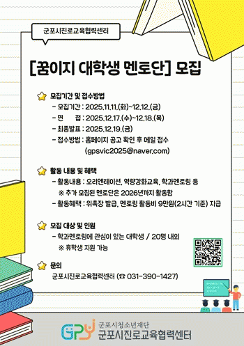 ¡®²ÞÀÌÁö ´ëÇлý ¸àÅä´Ü¡¯Àº ´ëÇлýÀÌ ÀÚ½ÅÀÇ Àü°ø°ú Áø·Î °æÇèÀ» ¹ÙÅÁÀ¸·Î °ü³» Áß¡¤°íµîÇлý¿¡°Ô Çаú ¹× Áø·Î Á¤º¸¸¦ Á¦°øÇÏ´Â ±³À°±âºÎ ÇÁ·Î±×·¥ÀÌ´Ù. ´ëÇлý ¸àÅäµéÀº û¼Ò³âµé¿¡°Ô Çö½ÇÀûÀÎ Áø·Î ¹æÇâÀ» Á¦½ÃÇϸç, ½º½º·ÎÀÇ Áø·Î¸¦ ±¸Ã¼ÀûÀ¸·Î ¼³°èÇÒ ¼ö ÀÖµµ·Ï µ½°í ÀÖ´Ù.