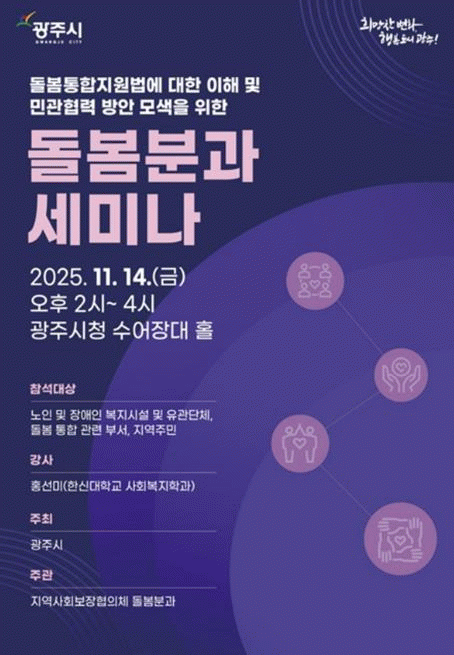 ù ¹øÂ° ¼¼¹Ì³ª´Â µ¹º½ºÐ°ú¿¡¼ ±âȹÇßÀ¸¸ç 14ÀÏ ¿ÀÈÄ 2½Ã ±¤ÁÖ½Ãû ¼ö¾îÀå´ëȦ¿¡¼ ¿¸°´Ù. ¡®µ¹º½ÅëÇÕÁö¿ø¹ý¿¡ ´ëÇÑ ÀÌÇØ ¹× ¹Î°üÇù·Â ¸ð»ö¡¯À» ÁÖÁ¦·Î È«¼±¹Ì ÇѽŴëÇб³ »çȸº¹ÁöÇаú ±³¼ö°¡ °¿¬ÀÚ·Î ³ª¼ ³»³â 3¿ù ½ÃÇà ¿¹Á¤ÀÎ µ¹º½ÅëÇÕÁö¿ø¹ýÀÇ ÁÖ¿ä ³»¿ë°ú ÅëÇÕ µ¹º½ ½ÇÇàÀ» À§ÇÑ ¹Î°üÇù·Â ¹æ¾È, Ÿ ÁöÀÚüÀÇ ¿ì¼ö»ç·Ê µîÀ» ¼Ò°³ÇÒ ¿¹Á¤ÀÌ´Ù.