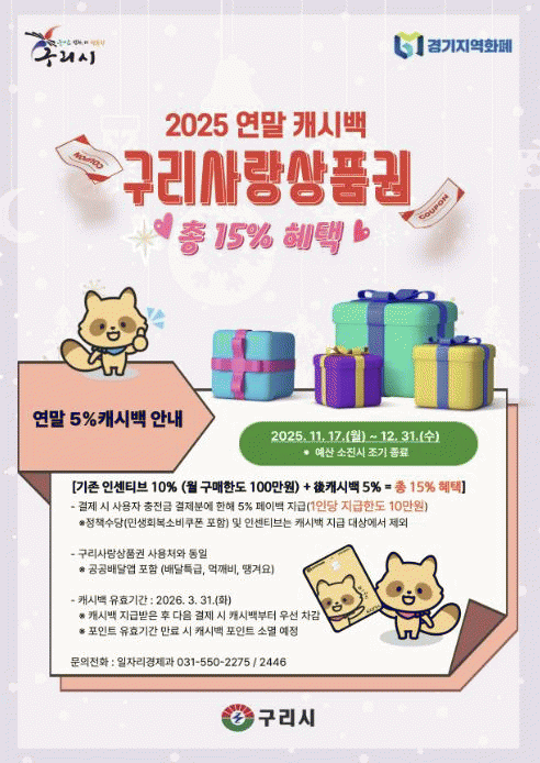 ±¸¸®½Ã´Â Àû¸³±Ý Áö¿ø°ú ÇÔ²² ½Ã¹Î Âü¿©Çü ¡®¿¬¸» ¸ÂÀÌ ±¸¸®»ç¶û»óǰ±Ç °áÁ¦ À̺¥Æ®¡¯¸¦ º´Çà ÃßÁøÇÑ´Ù. 11¿ù 24ÀϺÎÅÍ 12¿ù 7ÀϱîÁö ±¸¸®»ç¶û»óǰ±ÇÀ¸·Î ÀÏÁ¤ ±Ý¾× ÀÌ»ó °áÁ¦ÇÑ ½Ã¹ÎÀ» ´ë»óÀ¸·Î Ãß÷À» ÅëÇØ Àμ¾Æ¼ºê¸¦ Áö±ÞÇÑ´Ù.