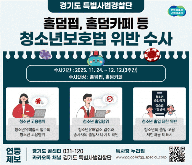 | °æ±âµµ Ư»ç°æ, Ȧ´ý Æà¡¤Ä«Æä û¼Ò³â ÃâÀÔ¡¤°í¿ë ºÒ¹ýÇàÀ§ ÁýÁß ¼ö»ç û¼Ò³â °í¿ëÇàÀ§, û¼Ò³â ÃâÀÔ ÇàÀ§, û¼Ò³â Á¢±ÙÁ¦ÇÑ Á¶Ä¡ ¹Ìºñ ÁßÁ¡ ¼ö»ç =Çѽ¸ñ ±âÀÚ |