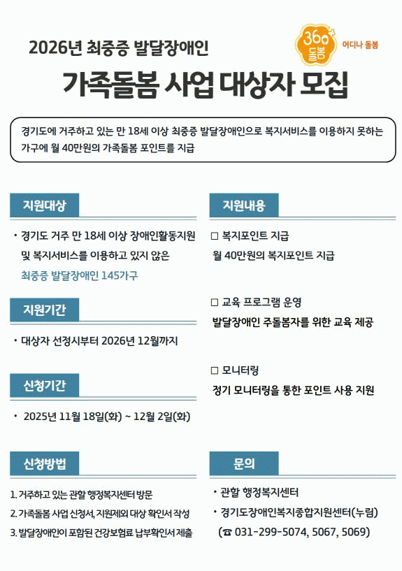 2026³â ÃÖÁßÁõ ¹ß´ÞÀå¾ÖÀÎ °¡Á·µ¹º½ »ç¾÷ÀÇ Áö¿ø ´ë»óÀº °æ±âµµ¿¡¼ °ÅÁÖÇÏ´Â º¹Áö°ü, Á÷¾÷ÀçȰ¼ºñ½º µî º¹Áö¼ºñ½º ¹ÌÀÌ¿ëÀ¸·Î µ¹º½»ç°¢Áö´ë¿¡ ³õÀÎ ¸¸ 18¼¼ ÀÌ»ó ¹ß´ÞÀå¾ÖÀÎÀÌ´Ù. ¼±Á¤ ½Ã ¿ù 40¸¸ ¿ø °¡Á·µ¹º½Æ÷ÀÎÆ®¸¦ 1³â°£ Áö¿øÇϰí Áö¼ÓÀûÀÎ ¸ð´ÏÅ͸µÀ¸·Î º¹Áö¼ºñ½º¿Í ´ë»óÀÚ¸¦ ¿¬°èÇÏ´Â ¼ºñ½º¸¦ Á¦°øÇÑ´Ù.