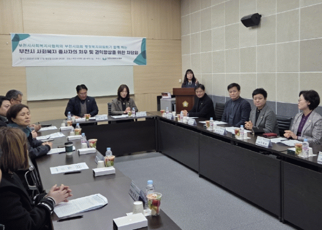 [NWS¹æ¼Û=Çѽ¸ñ ±âÀÚ]ºÎõ½ÃÀÇȸ ÇàÁ¤º¹ÁöÀ§¿øÈ¸´Â Áö³ 11¿ù 17ÀÏ ºÎõ½ÃÀÇȸ ¼¼¹Ì³ª½Ç¿¡¼ ºÎõ½Ã»çȸº¹Áö»çÇùȸ¿Í ÇÔ²² »çȸº¹Áö Á¾»çÀÚÀÇ Ã³¿ì ¹× ±ÇÀÍ Çâ»óÀ» ÁÖÁ¦·Î °£´ãȸ¸¦ °³ÃÖÇß´Ù.