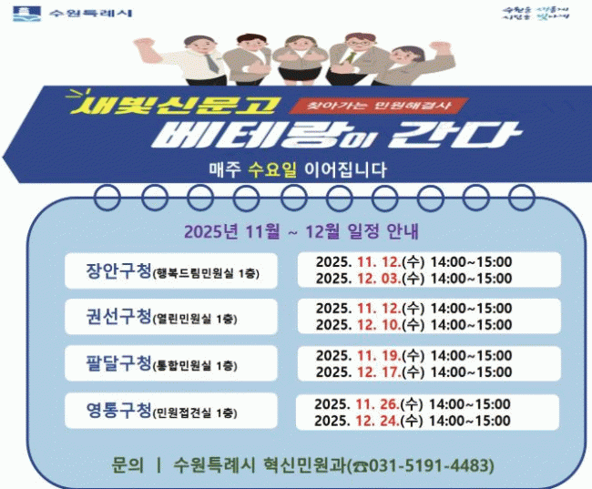¸ÅÁÖ ¼ö¿äÀÏ ÁøÇàµÇ´Â ÇöÀå »ó´ã¿¡´Â 20³â ÀÌ»ó °æ·ÂÀ» °®Ãá º£Å×¶û°ø¹«¿øÀÌ Âü¿©ÇØ ÇàÁ¤¡¤¼¼¹«¡¤»çȸº¹Áö¡¤°ÇÃࡤÅä¸ñ µî ´Ù¾çÇÑ ºÐ¾ßÀÇ ¹Î¿øÀ» »ó´ãÇØ ÁØ´Ù. »çÀü Á¢¼öÇÑ ¹Î¿øÀº ÇöÀå Á¶»ç¿Í °ü·Ã ºÎ¼ °£ ÇùÀǸ¦ ÁøÇàÇϰí, ÇÊ¿äÇÏ¸é ½Ã¹Î°íÃæÃ³¸®À§¿øÈ¸ ¾È°ÇÀ¸·Î »óÁ¤ÇÒ °èȹÀÌ´Ù.