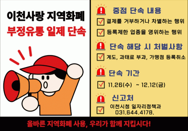 [NWS¹æ¼Û=ÇãÀº¼ ±âÀÚ]ÀÌõ½Ã´Â °æ±âÀÌõ»ç¶ûÁö¿ª»óǰ±ÇÀÇ ¿Ã¹Ù¸¥ »ç¿ë ȯ°æÀ» Á¶¼ºÇÏ°í °ÇÀüÇÑ À¯Åë Áú¼¸¦ È®¸³Çϱâ À§ÇØ 11¿ù 26ÀϺÎÅÍ 12¿ù 12ÀϱîÁö Áö¿ª»ç¶û»óǰ±Ç ºÎÁ¤À¯Åë ±ÙÀýÀ» À§ÇÑ ÀÏÁ¦ ´Ü¼ÓÀ» ÃßÁøÇÑ´Ù°í ¹àÇû´Ù.