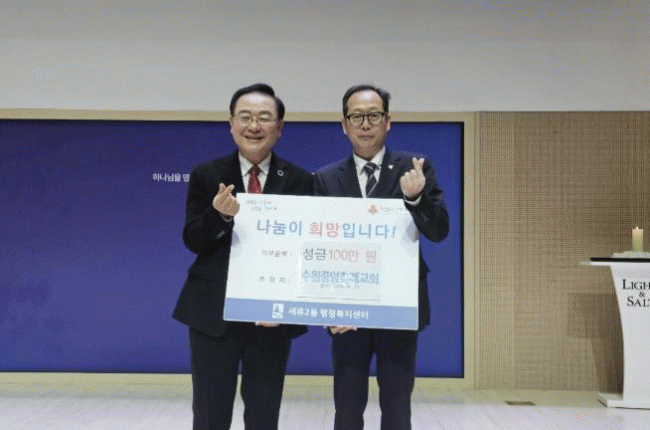 [NWS¹æ¼Û=Çѽ¸ñ ±âÀÚ]¼ö¿øÁß¾Óħ·Ê±³È¸´Â Áö³ 23ÀÏ, °ü³» Ãë¾à°èÃþÀ» À§ÇØ ºÒ¿ìÀÌ¿ôµ½±â 100¸¸¿ø ¼º±ÝÀ» ¼¼·ù2µ¿ ÇàÁ¤º¹Áö¼¾ÅÍ¿¡ ÈÄ¿øÇß´Ù.