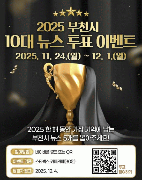 | ºÎõ½Ã, 2025³â 10´ë ´º½º ¼±Á¤ À§ÇÑ ¿Â¶óÀÎ ÅõÇ¥ ÁøÇà 11¿ù 24ÀϺÎÅÍ 12¿ù 1ÀϱîÁö ³×À̹öÆû¡¤QRÄÚµå ÅëÇØ Âü¿© =Çѽ¸ñ ±âÀÚ |