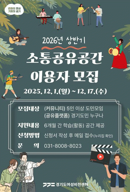 | °æ±âµµ¿©¼ººñÀü¼¾ÅÍ, 2026³â »ó¹Ý±â '¼ÒÅë°øÀ¯°ø°£' ÀÌ¿ëÀÚ ¸ðÁý Ä¿¹Â´ÏƼ °ø°£, °øÀ¯ Ç÷§Æû µî ÃÑ 9°³ÀÇ ¾ÈÁ¤ÀûÀÎ ¼Ò¸ðÀÓ ÇнÀ¡¤È°µ¿ °ø°£ Á¦°ø =Çѽ¸ñ ±âÀÚ |