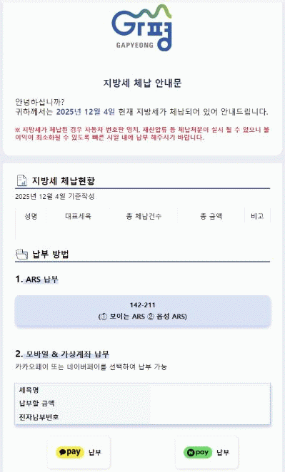 [NWS¹æ¼Û=Çѽ¸ñ ±âÀÚ]°¡Æò±ºÀÌ Áö¹æ¼¼ ü³³¾× ¡¼ö °­È­¸¦ À§ÇØ Ãֱ٠ü³³ÀÚ 4,790¸í¿¡°Ô ÃÑ 44¾ï ¿ø ±Ô¸ðÀÇ Áö¹æ¼¼ ü³³¾È³»¹®À» īī¿ÀÅå ¸ð¹ÙÀÏ ÀüÀÚ°íÁö·Î ÀÏÁ¦È÷ ¹ß¼ÛÇß´Ù.