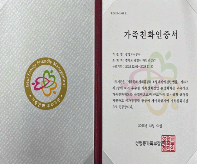 [NWS¹æ¼Û=Çѽ¸ñ ±âÀÚ]±¤¸íµµ½Ã°ø»ç´Â ¼ºÆòµî°¡Á·ºÎ¿¡¼ ÁÖ°üÇϰí Çѱ¹°æ¿µÀÎÁõ¿ø¿¡¼ ½É»çÇÑ °¡Á·Ä£ÈÀÎÁõ±â°ü ÀçÀÎÁõ ½É»ç¸¦ Åë°úÇÏ¿© 2025. 12. 1. ~ 2028. 11. 30.±îÁö ¡®°¡Á·Ä£È±â°ü¡¯À¸·Î ÀÎÁõ¹Þ¾Ò´Ù°í ¹àÇû´Ù.