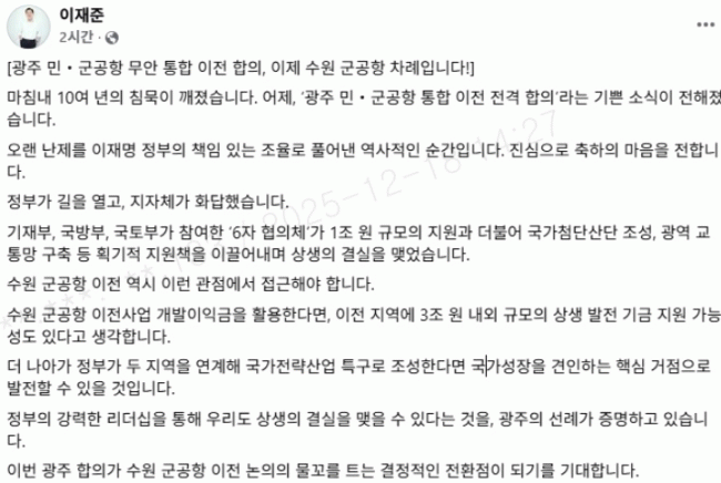 [NWS¹æ¼Û=Çѽ¸ñ ±âÀÚ]ÀÌÀçÁØ ¼ö¿øÆ¯·Ê½ÃÀåÀÌ ¡°±¤ÁÖ ¹Î¡¤±º°øÇ× ¹«¾È ÅëÇÕ ÀÌÀü ÇÕÀǰ¡ ¼ö¿ø ±º°øÇ× ÀÌÀü ³íÀÇÀÇ ¹°²¿¸¦ Æ®´Â °áÁ¤Àû ÀüȯÁ¡ÀÌ µÇ±æ ¹Ù¶õ´Ù¡±°í ¸»Çß´Ù.