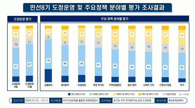 | 12¿ù ¹Î¼±8±â °æ±âµµÁ¤ ±àÁ¤Æò°¡ 67%. 9¿ù ´ëºñ 6%p »ó½Â µµÁ¤ ±àÁ¤Æò°¡ 67%. 9¿ù ´ëºñ 6%p »ó½Â, ºÎÁ¤Æò°¡´Â 21%·Î 1%p Ç϶ô =Çѽ¸ñ ±âÀÚ |