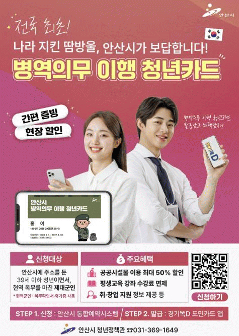 û³âÄ«µå ¹ß±Þ ´ë»óÀº ¾È»ê½Ã¿¡ Áֹεî·ÏÀÌ µÇ¾îÀÖ´Â 39¼¼ ÀÌÇÏ Ã»³â °¡¿îµ¥ Çö¿ª º¹¹«¸¦ ¸¶Ä£ Àǹ«¡¤Á߱⡤Àå±â º¹¹« Á¦´ë±ºÀÎÀÌ´Ù. ½ÅûÀº ¡®¾È»ê½ÃÅëÇÕ¿¹¾à½Ã½ºÅÛ¡¯À» ÅëÇØ ¿Â¶óÀÎÀ¸·Î °£ÆíÇÏ°Ô Á¢¼öÇÒ ¼ö ÀÖ´Ù. Çö¿ª º¹¹« ÁßÀÎ °æ¿ì, º¹¹«È®Àμ ¶Ç´Â ÈÞ°¡ÁõÀ» »ç¿ëÇØ µ¿ÀÏÇÑ ÇýÅÃÀ» ¹ÞÀ» ¼ö ÀÖ´Ù.