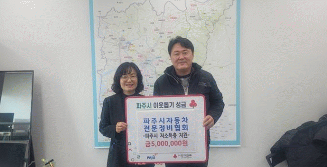 [NWS¹æ¼Û=Çѽ¸ñ ±âÀÚ]ÆÄÁֽô Áö³ 22ÀÏ, ÆÄÁÖ½ÃÀÚµ¿Â÷Àü¹®Á¤ºñÇùȸ°¡ ÆÄÁÖ½ÃûÀ» ¹æ¹®ÇÏ¿© °ü³» Ãë¾à°èÃþÀ» À§ÇØ ½á´Þ¶ó¸ç Çö±Ý 5¹é¸¸ ¿øÀ» ±âŹÇß´Ù°í ¹àÇû´Ù.