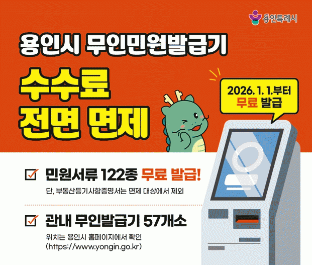 [NWS¹æ¼Û=Çѽ¸ñ ±âÀÚ]¿ëÀÎÆ¯·Ê½Ã´Â 2026³â 1¿ù 1ÀϺÎÅÍ Áö¿ª ³» ¼³Ä¡µÈ ¹«Àιοø¹ß±Þ±â¿¡¼­ ¹ß±ÞµÇ´Â ¹Î¿ø¼­·ù ¼ö¼ö·á¸¦ Àü¸é ¸éÁ¦ÇÑ´Ù°í 25ÀÏ ¹àÇû´Ù.