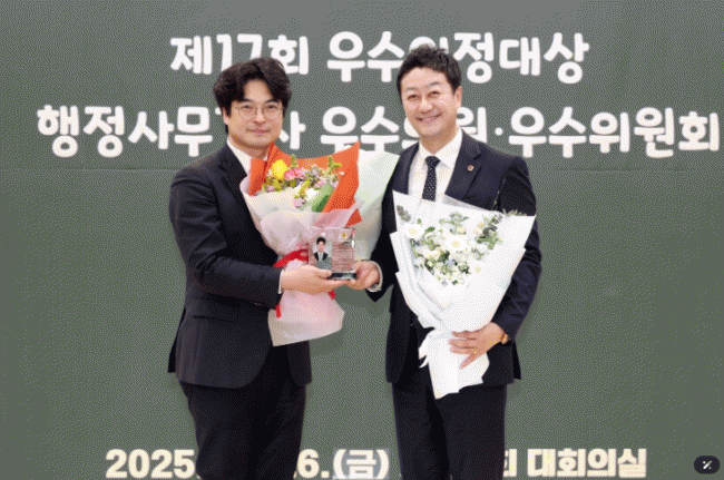 [NWS¹æ¼Û=Çѽ¸ñ ±âÀÚ]°æ±âµµÀÇȸ ¹Ú»óÇö ÀÇ¿ø(´õºÒ¾î¹ÎÁÖ´ç, ºÎõ8)ÀÌ 26ÀÏ °æ±âµµÀÇȸ ´ëȸÀǽǿ¡¼ ¿¸° ¡®Á¦17ȸ ¿ì¼öÀÇÁ¤´ë»ó¡¯ ½Ã»ó½Ä¿¡¼ ÇàÁ¤»ç¹«°¨»ç ¿ì¼öÀÇ¿øÀ¸·Î ¼±Á¤µÇ´Â ¿µ¿¹¸¦ ¾È¾Ò´Ù.