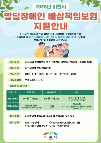 À̹ø º¸ÇèÀº ¹ß´ÞÀå¾ÖÀÎÀÌ ÀÏ»ó»ýȰÀ̳ª »çȸȰµ¿ Áß Å¸Àο¡°Ô ½ÅüÀû¡¤Àç»êÀû ÇÇÇØ¸¦ ÀÔÈù °æ¿ì¸¦ ´ëºñÇÑ °ÍÀ¸·Î, Áö¿ø ´ë»óÀº ÀÌõ½Ã¿¡ Áֹεî·ÏÀ» µÎ°í °ÅÁÖÇÏ´Â ÁöÀû¡¤ÀÚÆó¼º µî·ÏÀå¾ÖÀÎÀÌ´Ù. º°µµÀÇ ½Åû ÀýÂ÷ ¾øÀÌ ´ë»óÀÚ Àü¿øÀÌ ÀÚµ¿ °¡ÀԵǸç, ÀÌõ½Ã°¡ º¸Çè»ç¿Í Á÷Á¢ °è¾àÇÏ°í º¸Çè·á Àü¾×À» Áö¿øÇÑ´Ù. º¸Àå ±â°£Àº 2026³â 1¿ù 1ÀϺÎÅÍ 12¿ù 31ÀϱîÁö 1³â°£À̸ç, ÀÌÈÄ ¸Å³â °»½ÅÇÒ ¿¹Á¤ÀÌ´Ù.