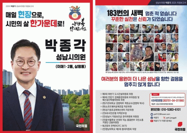 [NWS¹æ¼Û=Çѽ¸ñ ±âÀÚ]¼º³²½ÃÀÇȸ ¹ÚÁ¾°¢ ÀÇ¿ø(±¹¹ÎÀÇÈû, À̸Å1¡¤2µ¿¡¤»ïÆòµ¿)ÀÌ 2025³â ÀÇÁ¤È°µ¿ ¼º°ú¸¦ Á¤¸®ÇÑ ÀÇÁ¤º¸°í¼¸¦ ¹ß°£Çß´Ù. Á¦9´ë ½ÃÀÇȸ Àӱ⠵¿¾È ÇöÀåÀ» ´©ºó Ȱµ¿°ú Áö¿ª ¹Î»ý °³¼±ÀÇ °á°úµéÀ» ´ã¾Æ³½ ³»¿ëÀÌ´Ù.