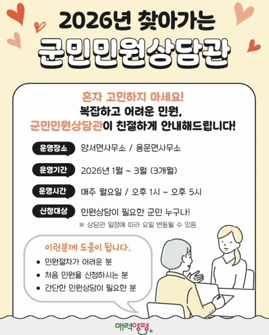 ¡®±º¹Î¹Î¿ø»ó´ã°ü¡¯Àº ¾çÆò±º ÇàÁ¤µ¿¿ìȸ ¼Ò¼Ó ÅðÁ÷ °ø¹«¿øÀ» À§ÃËÇØ ¿î¿µµÇ¸ç, dzºÎÇÑ ÇàÁ¤ °æÇè°ú Àü¹®¼ºÀ» ¹ÙÅÁÀ¸·Î °¢Á¾ ÇàÁ¤ ¹Î¿ø¿¡ ´ëÇÑ »ó´ã°ú ¾È³»¸¦ Á¦°øÇÑ´Ù. ÇàÁ¤ ÀýÂ÷¿¡ ´ëÇÑ ÀÌÇØµµ°¡ ³ôÀº Àü¹®°¡°¡ Á÷Á¢ »ó´ã¿¡ ³ª¼ ¹Î¿øÀÎÀÇ ±Ã±ÝÁõÀ» Á¤È®ÇÏ°í ½Å¼ÓÇÏ°Ô ÇØ°áÇÒ ¼ö ÀÖÀ» °ÍÀ¸·Î ±â´ëµÈ´Ù.