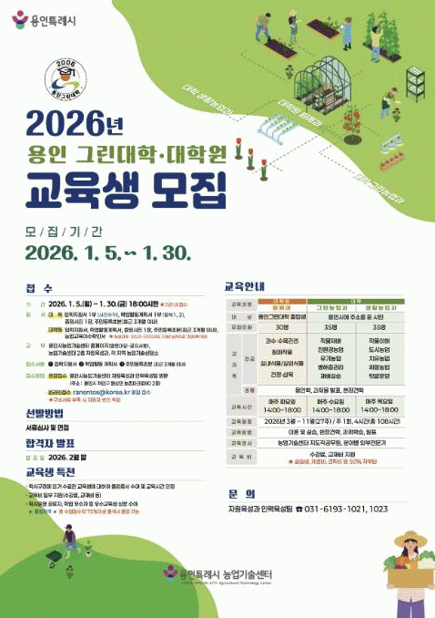 | ¿ëÀÎÆ¯·Ê½Ã, 2026³â ¿ëÀα׸°´ëÇÐ?´ëÇпø ±³À°»ý ¸ðÁý 1¿ù 30ÀϱîÁö ¿ø¿¹°ú?±×¸°³ó¾÷°ú?»ýȰ³ó¾÷°ú ±³À°»ý ÃÑ 100¸í ¸ðÁý =Çѽ¸ñ ±âÀÚ |