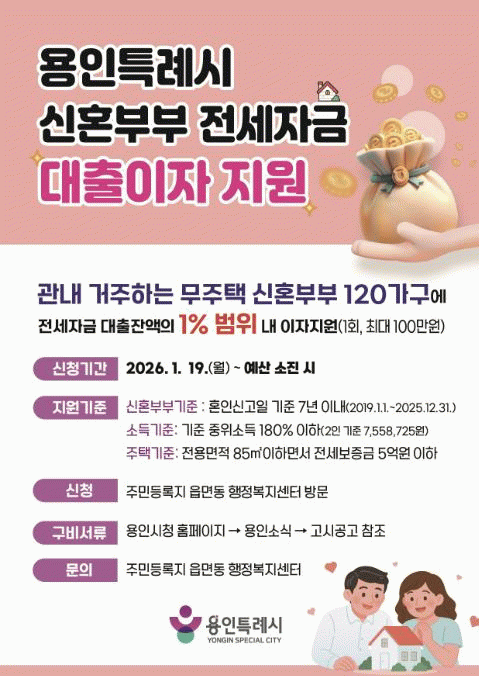 | ¿ëÀÎÆ¯·Ê½Ã, 2026³â ½ÅÈ¥ºÎºÎ Àü¼¼ÀÚ±Ý ´ëÃâÀÌÀÚ Áö¿ø»ç¾÷ ½Åû Á¢¼ö 1¿ù 19ÀϺÎÅÍ 2¿ù 6ÀϱîÁö °ÅÁÖÁö ÇàÁ¤º¹Áö¼¾ÅÍ¿¡¼ ½Åû¡¦ÃÖ´ë 100¸¸¿ø±îÁö Áö¿ø =Çѽ¸ñ ±âÀÚ |