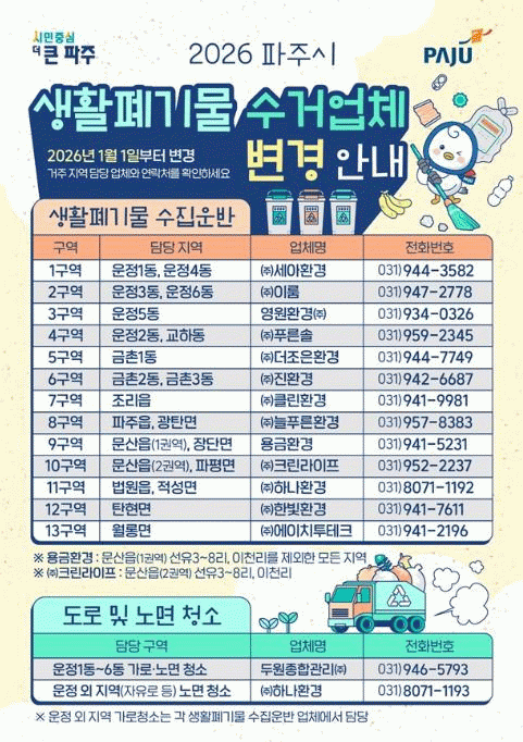 [NWS¹æ¼Û=Çѽ¸ñ ±âÀÚ]ÆÄÁֽô 2026³â 1¿ù 1ÀϺÎÅÍ °ü³» »ýȰÆó±â¹°(¾²·¹±â) ¼öÁý¡¤¿î¹Ý ´ëÇà¾÷ü°¡ º¯°æµÊ¿¡ µû¶ó, ½Ã¹Î¿¡°Ô Á¤È®ÇÑ Á¤º¸¸¦ ¾È³»Çϰí ÇöÀå ¿î¿µÀÌ ¿øÈ°È÷ Á¤ÂøµÉ ¼ö ÀÖµµ·Ï È«º¸¿Í ¾È³»¸¦ °ÈÇϰí ÀÖ´Ù°í ¹àÇû´Ù.