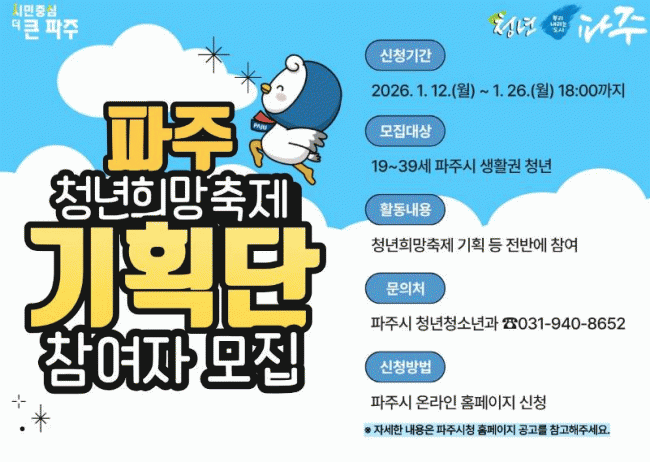 | 2026³â ÆÄÁÖ Ã»³âÈñ¸ÁÃàÁ¦ ±âȹ´Ü Âü¿©ÀÚ ¸ðÁý û³âÀÇ ¾ÆÀ̵ð¾î·Î ¿Ï¼ºµÇ´Â ÃàÁ¦ÀÇ Àå! =Çѽ¸ñ ±âÀÚ |