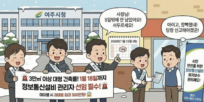 ÇöÀç ¿©Áֽà ³» ¿¬¸éÀû 3¸¸§³ ÀÌ»óÀÎ ´ëÇü °ÇÃ๰ÀÇ °ü¸®ÁÖü´Â ¿À´Â 2026³â 1¿ù 18ÀϱîÁö Á¤º¸Åë½Å¼³ºñ À¯Áöº¸¼ö °ü¸®ÀÚ¸¦ ¼±ÀÓÇϰí ÁöÀÚü¿¡ ½Å°í¸¦ ¿Ï·áÇØ¾ß ÇÕ´Ï´Ù.