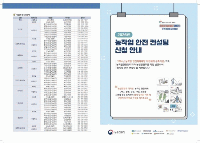 À̹ø »ç¾÷Àº ³óÀÛ¾÷ °úÁ¤¿¡¼ ¹ß»ýÇÒ ¼ö ÀÖ´Â °¢Á¾ »ç°í¿Í ÀçÇØ¸¦ »çÀü¿¡ ¿¹¹æÇÏ°í ³ó¾÷ÀÎÀÇ ¾ÈÀüÀǽÄÀ» ³ôÀ̱â À§ÇØ ÃßÁøµÈ´Ù. Àü¹® ³óÀÛ¾÷¾ÈÀü°ü¸®ÀÚ°¡ ³ó°¡¸¦ Á÷Á¢ ¹æ¹®ÇØ ÇöÀå Áß½ÉÀÇ À§Ç輺 Æò°¡¸¦ ½Ç½ÃÇϰí, ¾ÈÀüº¸°Ç °ü¸®Ã¼°è ±¸ÃàÀ» À§ÇÑ ¸ÂÃãÇü »ó´ãÀ» Á¦°øÇÑ´Ù.