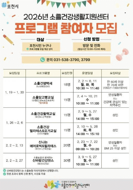 | Æ÷õ½Ã ¼ÒÈê°Ç°»ýȰÁö¿ø¼¾ÅÍ, 2026³â »ó¹Ý±â °Ç° ÁõÁø ÇÁ·Î±×·¥ Âü¿©ÀÚ ¸ðÁý =Çѽ¸ñ ±âÀÚ |