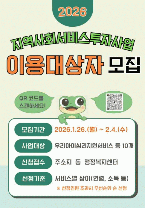 | ¼ö¿øÆ¯·Ê½Ã, 2026³â Áö¿ª»çȸ¼ºñ½º ÅõÀÚ»ç¾÷ ÀÌ¿ëÀÚ ¸ðÁý 1¿ù 26ÀÏ~2¿ù4ÀÏ ÁÖ¼ÒÁö µ¿ ÇàÁ¤º¹Áö¼¾ÅÍ ¹æ¹®ÇØ ½ÅÃ»ÇØ¾ß =Çѽ¸ñ ±âÀÚ |