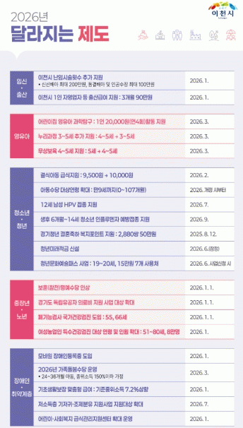 º¹Áö¡¤º¸À° ºÐ¾ß¿¡¼´Â ½Ã¹ÎÀÇ »ýȰ ¾ÈÁ¤À» ³ôÀÌ°í µ¹º½ ºÎ´ãÀ» ¿ÏÈÇϱâ À§ÇÑ Á¦µµ °³¼±ÀÌ ´ëÆø È®´ëµÈ´Ù. ±âÁØ ÁßÀ§¼ÒµæÀÌ 6.51% ÀλóµÇ¸é¼ ÃÖÀú»ýȰ º¸ÀåÀÌ °ÈµÈ´Ù. °á½Ä¾Æµ¿ ±Þ½ÄÁö¿ø ´Ü°¡°¡ ±âÁ¸ 9,500¿ø¿¡¼ 10,000¿øÀ¸·Î ÀλóµÆÀ¸¸ç, ¾Æµ¿¼ö´ç ´ë»ó¿¬·ÉÀº ¸¸ 8¼¼¿¡¼ ¸¸ 9¼¼ »ýÀÏÀÌ µµ·¡ÇÏ´Â ´ÞÀÇ Àü ´Þ±îÁö·Î 12°³¿ù È®´ëµÆ´Ù. ¶ÇÇÑ ½Ç¹° µî·ÏÁõ°ú µ¿ÀÏÇÑ È¿·ÂÀ» °®´Â ¸ð¹ÙÀÏ Àå¾ÖÀεî·ÏÁõÀÌ µµÀԵŠÀå¾ÖÀÎ À̵¿±Ç°ú ÆíÀǼºÀÌ Å©°Ô Çâ»óµÉ Àü¸ÁÀÌ´Ù. ÀÌ ¹Û¿¡µµ °ü³» ¾î¸°ÀÌÁý Àç¿ø ÁßÀÎ ¹Ìµî·Ï ÀÌÁÖ¹è°æ¾Æµ¿À» ´ë»óÀ¸·Î 1ÀÎ´ç ¿ù 10¸¸ ¿øÀÇ º¸À°Áö¿ø±ÝÀÌ ÇØ´ç ¾î¸°ÀÌÁýÀ¸·Î Áö±ÞµÇ¸ç, ¾Æºü ÈÞÁ÷ Àå·Á±Ý Áö¿ø»ç¾÷, Àå³°¨ ¹«Àιݳ³ÇÔ(À°¾ÆÁ¾ÇÕÁö¿ø¼¾ÅÍ ¾ÆÀ̶ûÄ«Æä 2È£Á¡)µµ »õ·Ó°Ô ¿î¿µµÈ´Ù.