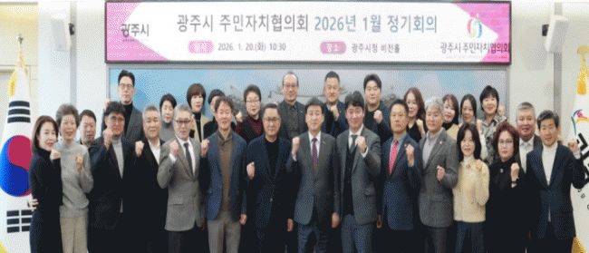 [NWS¹æ¼Û=Çѽ¸ñ ±âÀÚ]±¤Áֽô Áö³ 20ÀÏ ½Ãû ºñÀüȦ¿¡¼ À¾¸éµ¿ ÁÖ¹ÎÀÚÄ¡À§¿øÀå, ȸÀå, »ç¹«±¹Àå µîÀÌ Âü¼®ÇÑ °¡¿îµ¥ ¡®±¤Áֽà ÁÖ¹ÎÀÚÄ¡ÇùÀÇȸ 2026³â 1¿ù Á¤±âȸÀÇ¡¯¸¦ ¿°í Á¦10´ë ±¤Áֽà ÁÖ¹ÎÀÚÄ¡ÇùÀÇȸ¸¦ À̲ø ÇùÀÇȸÀå°ú ÀÓ¿øÀ» ¼±ÃâÇß´Ù.