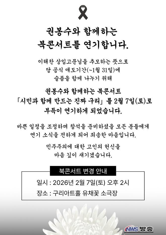 ±ÇºÀ¼ö ±¸¸®½ÃÀÇ¿øÀº 27ÀÏ ÀÚ½ÅÀÇ ÆäÀ̽ººÏ¿¡ ¡°ÀÌÇØÂù »óÀÓ°í¹®´ÔÀ» Ã߸ðÇÏ´Â ¶æÀ¸·Î ´ç °ø½Ä ¾Öµµ±â°£(~1 31ÀÏ)¿¡ ½½ÇÄÀ» ÇÔ²² ³ª´©±â À§ÇØ ºÏÄܼƮ¸¦ 2¿ù 7ÀÏ(Åä)·Î ¿¬±âÇÑ´Ù¡±¸ç ¾çÇØ¸¦ ±¸Çß´Ù.