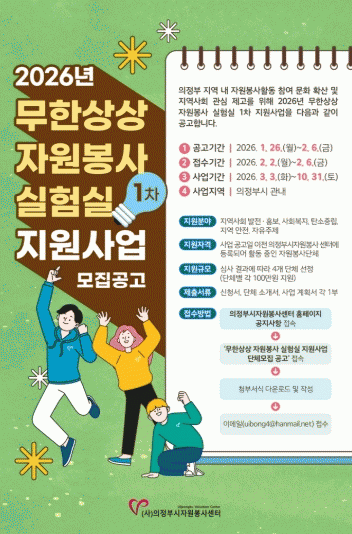 (»ç)ÀÇÁ¤ºÎ½ÃÀÚ¿øºÀ»ç¼¾ÅÍ'2026³â ¹«ÇÑ»ó»ó ÀÚ¿øºÀ»ç ½ÇÇè½Ç' 1Â÷ Áö¿ø»ç¾÷ °ø¸ð