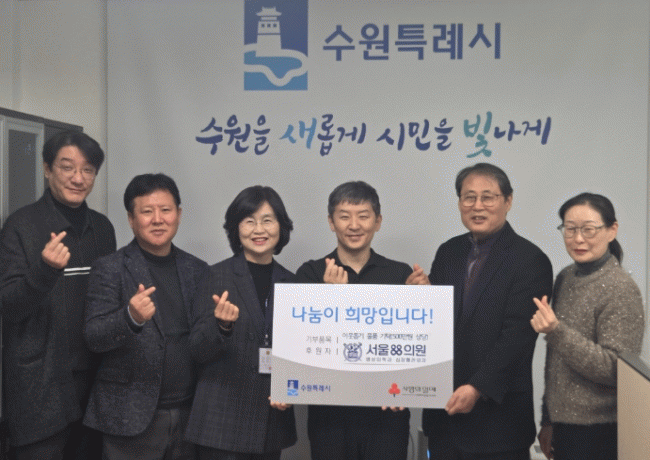 À±¿µ¼÷ ¼ö¿ø½Ã ½Ã¹Îº¹Áö±¹Àå(¿ÞÂÊ 3¹øÂ°ºÎÅÍ)°ú Á¤ÇýµÎ ¼­¿ï88ÀÇ¿ø ´ëÇ¥¿øÀå, ±è¿µ±â ¼ö¿ø½Ã¸³³ëÀÎÀü¹®¿ä¾ç¿øÀå µî °ü°èÀÚµéÀÌ Àü´Þ½Ä ÈÄ ±â³ä»çÁøÀ» Âï°í ÀÖ´Ù.