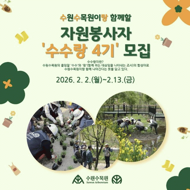 | ¼ö¿øÆ¯·Ê½Ã, ¼ö¿ø¼ö¸ñ¿ø ÀÚ¿øºÀ»çÀÚ '¼ö¼ö¶û' 4±â ¸ðÁý 2¿ù 2ÀϺÎÅÍ 2¿ù 13ÀϱîÁö ÀϹݡ¤Çؼ³ ÀÚ¿øºÀ»çÀÚ ÃÑ 60¸í ¼±¹ß =Çѽ¸ñ ±âÀÚ |