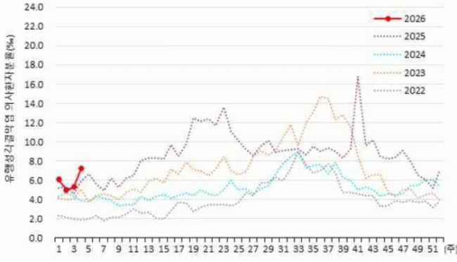 Áúº´°ü¸®Ã» Ç¥º»°¨½Ã ÀÚ·á¿¡ µû¸£¸é, 1¿ù ³Ý° ÁÖ À¯Ç༺°á¸·¿° ÀÇ»çȯÀÚ ºÐÀ²Àº Àα¸ 1,000¸í´ç 7.2¸íÀ¸·Î Áý°èµÆ´Ù. ÀÌ´Â ÀüÁÖ(5.3¸í)º¸´Ù Áõ°¡ÇÑ ¼öÄ¡·Î, 2022³âºÎÅÍ 2025³â±îÁö ÃÖ±Ù 4³â°£ °°Àº ±â°£°ú ºñ±³Çصµ °¡Àå ³ôÀº ¼öÁØÀÌ´Ù.