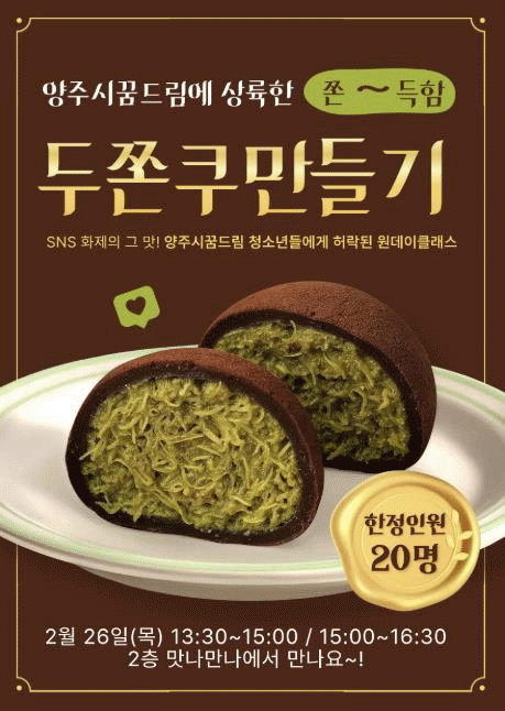 ÇÁ·Î±×·¥Àº 13½Ã 30ºÐºÎÅÍ 15½Ã±îÁö, 15½ÃºÎÅÍ 16½Ã 30ºÐ±îÁö ÃÑ 2ȸ·Î ³ª´µ¾î ÁøÇàµÇ¸ç, ¾çÁÖû¼Ò³â¹®ÈÀÇÁý 2Ãþ Á¶¸®°ø°£ ¡®¸À³ª¸¸³ª¡¯¿¡¼ ¿î¿µµÈ´Ù. Âü¿©ÀοøÀº ÁýÁßµµ ³ôÀº üÇèÀÌ °¡´ÉÇϵµ·Ï ȸÂ÷º° ÃÑ 20¸í ±Ô¸ð·Î ¸ðÁýÇÏ¿© ÁøÇàÇÑ´Ù.