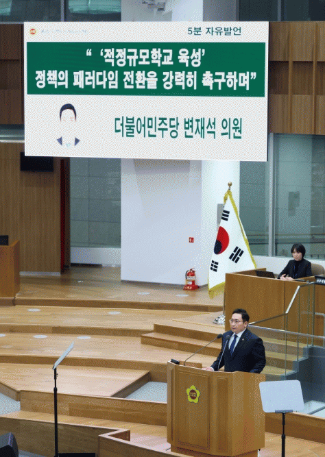 [NWS¹æ¼Û=Çѽ¸ñ ±âÀÚ]°æ±âµµÀÇȸ ±³À°ÇàÁ¤À§¿øÈ¸ ¼Ò¼Ó º¯Àç¼® ÀÇ¿ø(´õºÒ¾î¹ÎÁÖ´ç, °í¾ç1)Àº 4ÀÏ ¿¸° °æ±âµµÀÇȸ º»È¸ÀÇ 5ºÐ ÀÚÀ¯¹ß¾ðÀ» ÅëÇØ °æ±âµµ±³À°Ã»ÀÇ ¡®ÀûÁ¤±Ô¸ðÇб³ À°¼º¡¯ Á¤Ã¥ÀÌ ÅëÆóÇÕ°ú Æó±³ Áß½ÉÀ¸·Î ÀÛµ¿Çϰí ÀÖ´Ù¸ç, Á¤Ã¥ÀÇ ÆÐ·¯´ÙÀÓÀ» ¡®Á¤¸®¡¯°¡ ¾Æ´Ñ ¡®Áö¿ø¡¯ Áß½ÉÀ¸·Î ÀüȯÇÒ °ÍÀ» °·ÂÈ÷ Ã˱¸Çß´Ù.