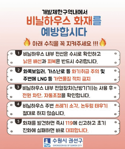 ÀÌ¿¡ ±Ç¼±±¸ °ÇÃà°ú´Â °ü³» °³¹ßÁ¦Çѱ¸¿ª ³» ºñ´ÒÇϿ콺¸¦ Áß½ÉÀ¸·Î ÇöÀå Á¡°ËÀ» ½Ç½ÃÇϰí, ½Ã¼³ °ü¸®ÀÚ¿Í ³ó¾÷ Á¾»çÀÚ¸¦ ´ë»óÀ¸·Î ÈÀç ¿¹¹æ ¾È³»¹®À» ¹èÆ÷ÇÏ¸ç ¾ÈÀü¼öÄ¢ Áؼö¸¦ ´çºÎÇß´Ù.