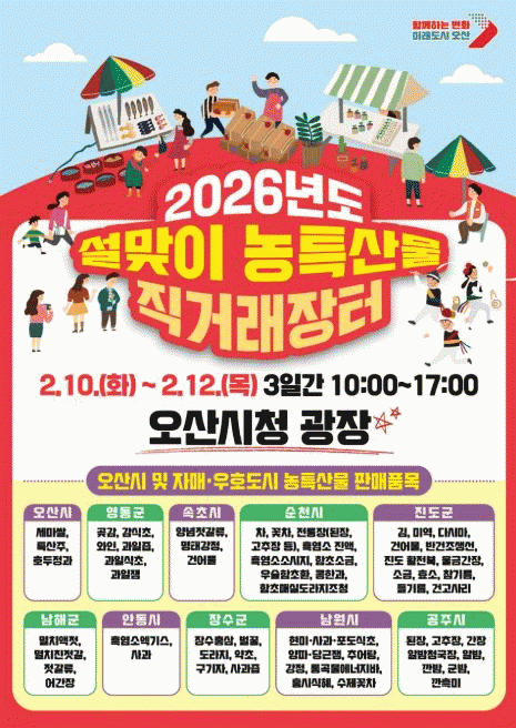 [NWS¹æ¼Û=Çѽ¸ñ ±âÀÚ]¿À»ê½Ã´Â ¼³ ¸íÀýÀ» ¸Â¾Æ ¿À´Â 2¿ù 10ÀϺÎÅÍ 12ÀϱîÁö 3Àϰ£, ¿ÀÀü 10½ÃºÎÅÍ ¿ÀÈÄ 5½Ã±îÁö ¿À»ê½Ãû ±¤Àå¿¡¼­ Àڸš¤¿ìÈ£µµ½Ã¿Í ÇÔ²²ÇÏ´Â ¡®¼³¸ÂÀÌ ³óƯ»ê¹° Á÷°Å·¡ÀåÅÍ¡¯¸¦ °³ÃÖÇÑ´Ù°í ¹àÇû´Ù.